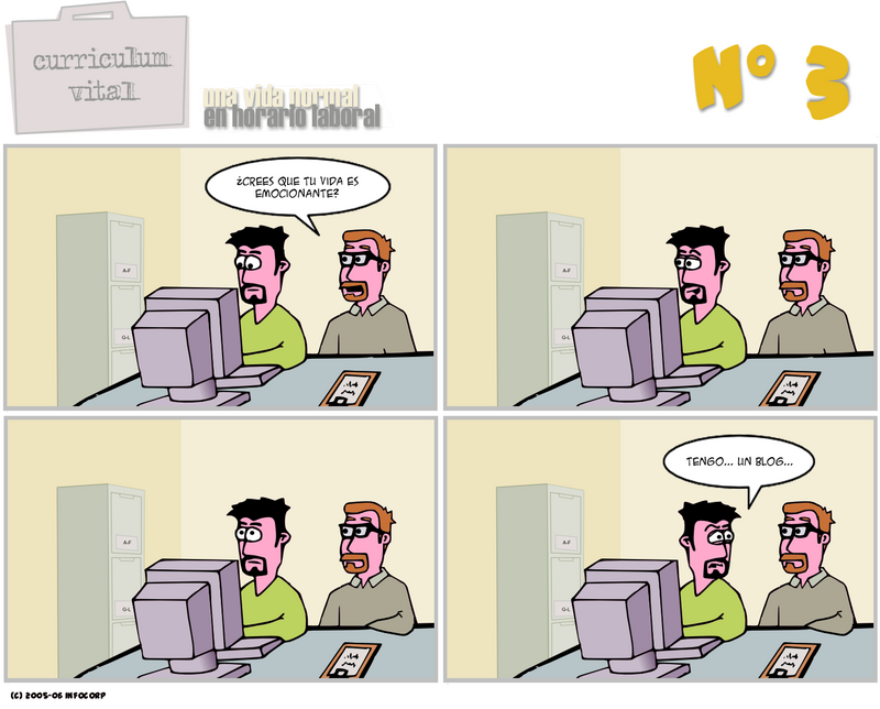 Os traigo algunos cómics que hice hace tiempo cuando aún dibujaba como un niño de 8 años y que estaban olvidados por Mis Documentos. Tratan sobre la blogosfera (o como diablos se escriba). Cómic 1; Cómic 2; Cómic 3.